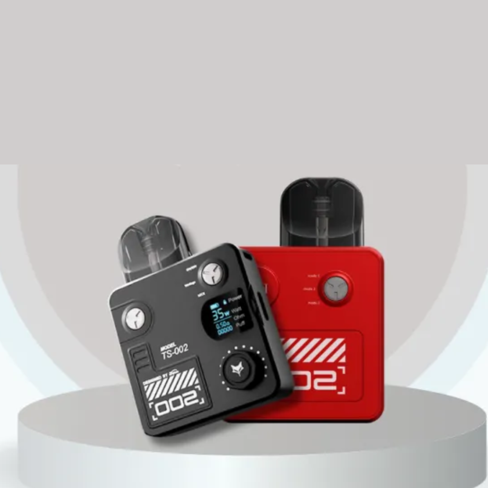 This is the MODEL TS-002 pod system, a distinctive, ultra-compact device with a squared-off, industrial aesthetic. It features a small, integrated digital screen that displays the wattage (35W in the image), resistance, puff count, and battery level.