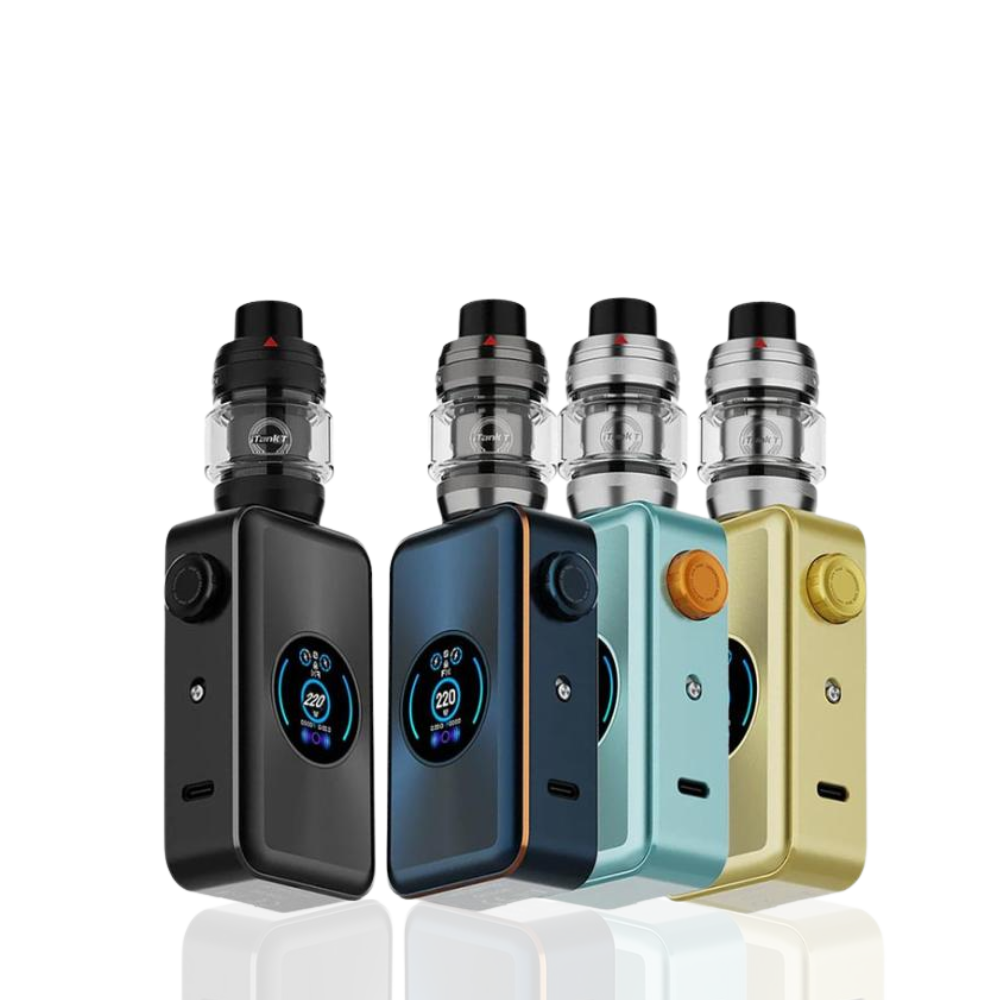 The main device (mod) features a robust, box-style body with a full TPU protection covering (the external shell) for maximum durability. It has a large color display screen showing a wattage of 220W and a distinctive, prominent control wheel/dial for adjustments. The kit comes with a top-mounted tank (iTank 2). The colors shown are Black, Blue/Orange, Cyan, and Gold, all emphasizing a rugged, high-performance aesthetic.